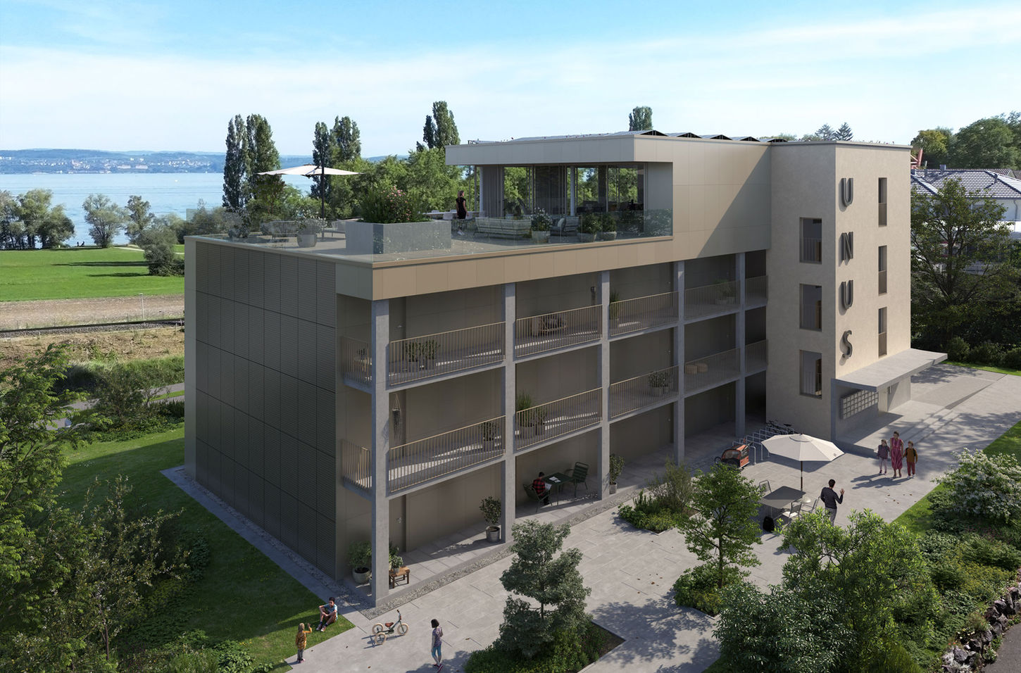 Ein zentrales Untergeschoss mit Parking, technischen Räumen und Kellerabteilen bildet gewissermassen das Fundament, worauf die UNUS Einheiten gestapelt werden. Es folgen drei Geschosse mit jeweils 8 Einheiten pro Geschoss und ein Attikageschoss mit 5 Einheiten. Ein besonderes Merkmal dieses Projektes ist die direkte und unverbaubare Seesicht von allen Wohnungen sowie von der gemeinschaftlich genutzten Dachterrasse.